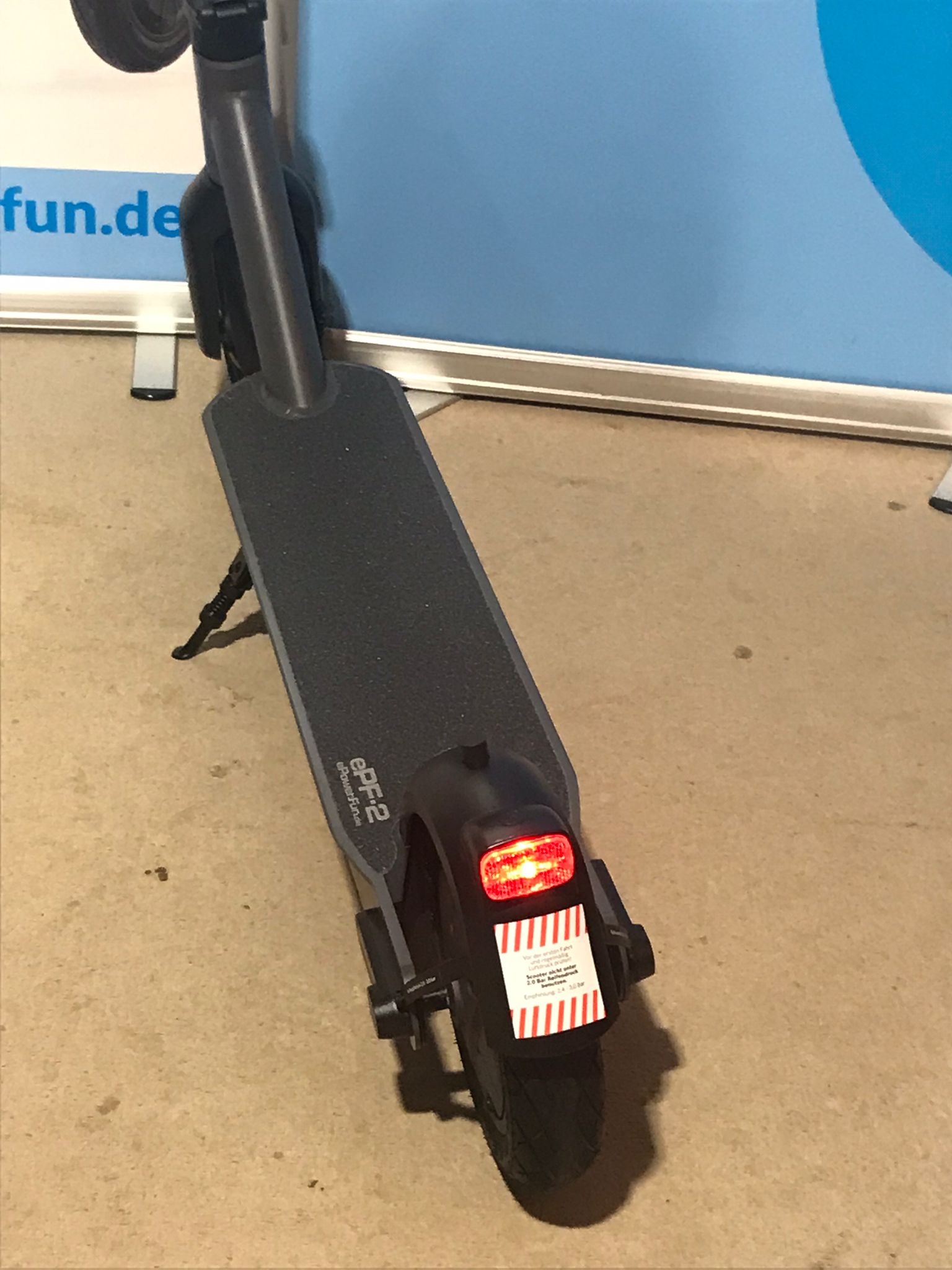 Nicht direkt in Frontlicht, Rücklicht oder Blinker des eScooters blicken. Mögliche Augenschädigung durch grelles Licht. Die Lichter können bei gefährdeten Personen epileptische Anfälle auslösen.
