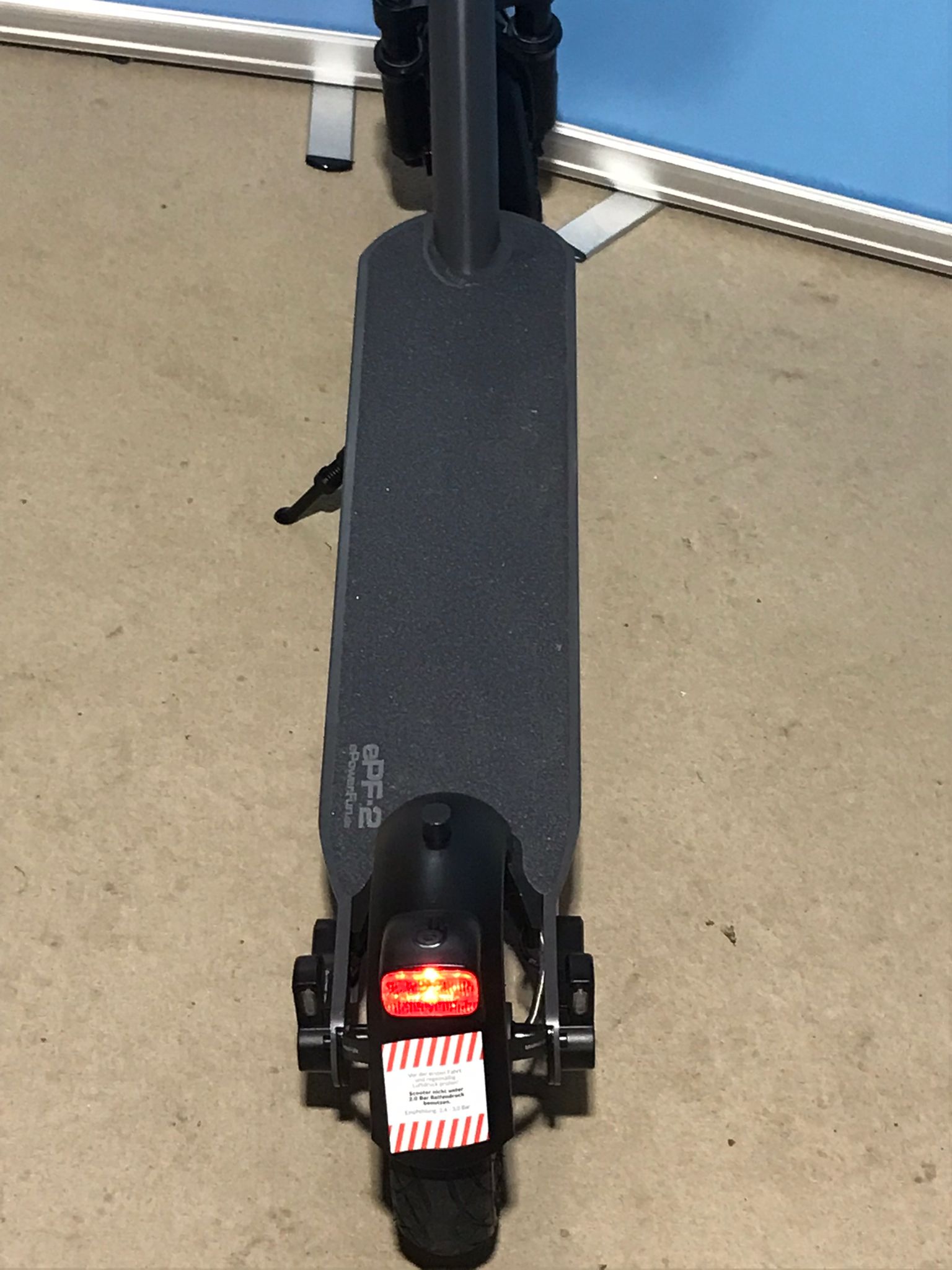 Nicht direkt in Frontlicht, Rücklicht oder Blinker des eScooters blicken. Mögliche Augenschädigung durch grelles Licht. Die Lichter können bei gefährdeten Personen epileptische Anfälle auslösen.